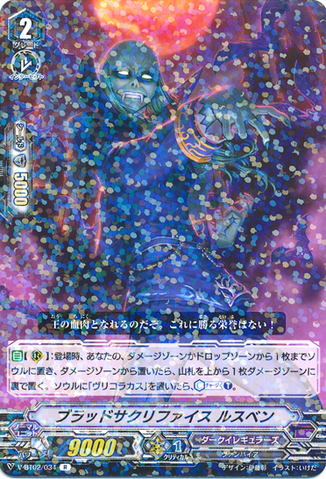 AUTO [V]: At the end of the battle that it attacked, if you have thirteen cards or more in your soul, COST[C-Blast (1) & choose a card from your hand and three of your rear-guards, and put them into your soul], choose a card from your soul, ride it as [Stand], and it gets [Critical] +1 until end of turn.