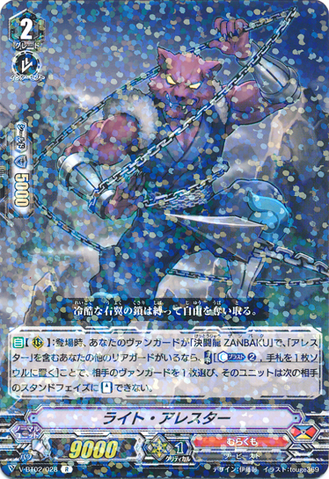 ACT [V] [1/Turn]: COST[C-Blast (1) & S-Blast (1)], search your deck for up to one card with "Arrester" in its card name, call it to [R], shuffle your deck, and this unit gets [Power] +5000 until end of turn. If "Right Arrester" and "Left Arrester" are on your [R], your opponent cannot ride a grade 3 or greater from a grade 3 on his or her next ride phase.