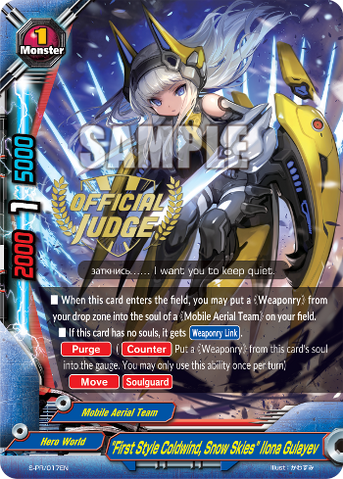 - When this card enters the field, you may put a 《Weaponry》 from your drop zone into the soul of a 《Mobile Aerial Team》 on your field.