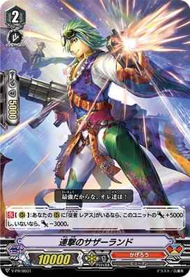 AUTO [R]: When placed, one of your other rear-guards gets [Power] +3000 until end of turn. If that unit is "Chain-attack Sutherland", it gets [Power] +5000 instead of +3000.