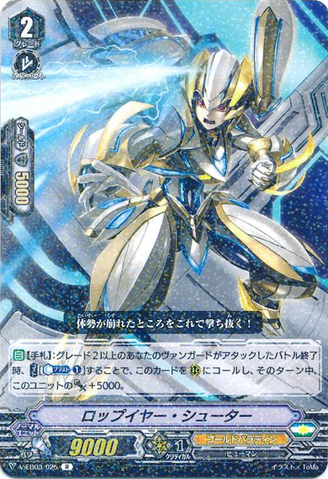ACT [V] [1/Turn]: COST[C-Blast (1) & retire one rear-guard], look at five cards from the top of your deck, call up to two cards from among them to [R], and shuffle your deck. If you have a grade 3 in your soul, call up to three cards instead of two, and three of your front row units get [Power] +10000 until end of turn.