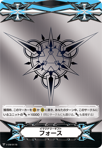 When acquired, put this marker on your [V] or [R], and the unit on this circle gets [Power] +10000 during your turn! (You may put in on the same circle. The [Power] stacks too)