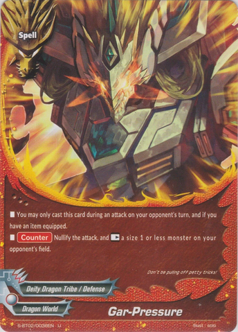 - [Counter] Nullify the attack. Then, if you have a 《Dragod》 on your field, destroy a card on your opponent's field.