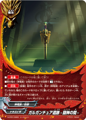 - [Counter] 【Act】 During your opponent's turn, if you have a 《Deity Dragon Tribe》 item equipped, you may put this card from the field into the drop zone. If you do, for this turn, the next time damage would be dealt to you is reduced by 3.