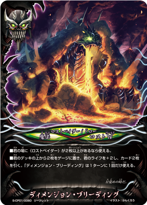 - Put the top two cards of your deck into your gauge, you gain 2 life, and draw two cards. You may only cast "Dimension Bleeding" once per turn.