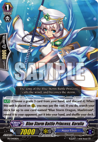 Auto: [Choose a grade 3 card from your hand, and discard it] When this unit is placed on [R], you may pay the cost. If you do, search your deck for up to one card named 「Blue Storm Dragon, Maelstorm」, reveal it to your opponent, put it into your hand, and shuffle your deck.
