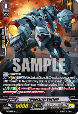 Activate [R]: [Counter Blast (1) & Retire this unit] if you have a vanguard with 「Raizer」 in its card name, choose one of your other rear-guards with 「Raizer」 in its card name, until end of turn, this unit gets Auto [R] [1/Turn]: When your vanguard attacks, [Stand] this unit, and this unit gets [Power] +5000 until end of turn..