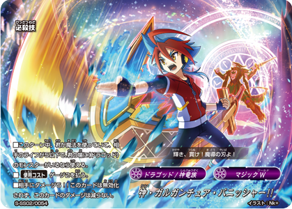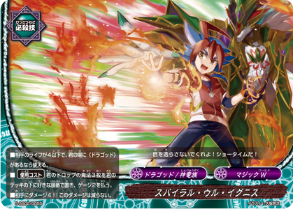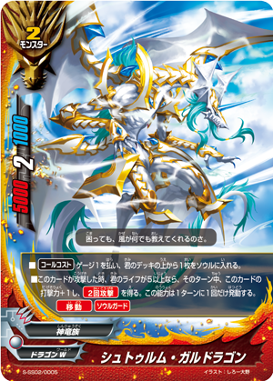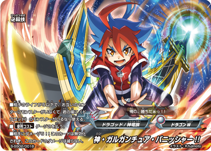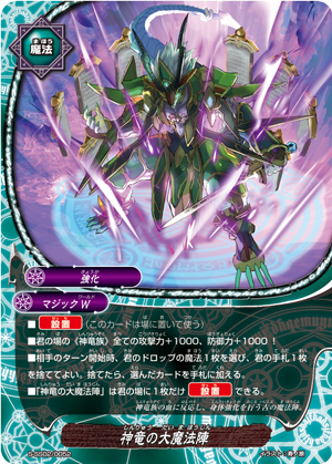 - When this card enters the field, you may drop a 《Deity Dragon Tribe》 from your hand. If you do, put the top card of your deck into your gauge, and draw two cards.