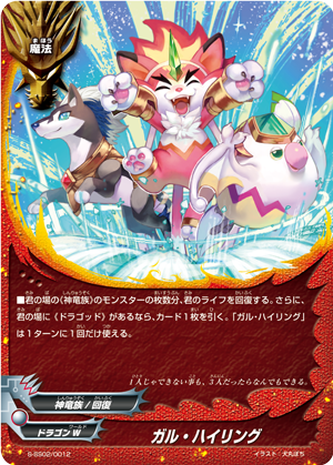 - You gain life equal to the number of 《Deity Dragon Tribe》 on your field. Then, if you have a 《Dragod》 on your field, draw a card. You may only cast "Gar Hiring" once per turn.