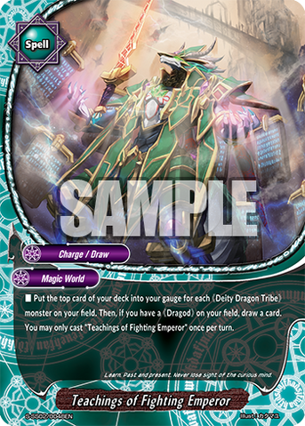- Put the top card of your deck into your gauge for each 《Deity Dragon Tribe》 monster on your field. Then, if you have a 《Dragod》 on your field, draw a card. You may only cast "Teachings of Fighting Emperor" once per turn.