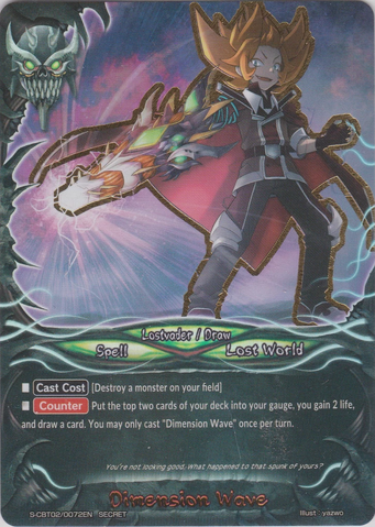 - [Counter] Put the top two cards of your deck into your gauge, you gain 2 life, and draw a card. You may only cast "Dimension Wave" once per turn.