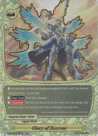 - [Counter] Put the top two cards of your deck into your gauge, and draw 2 cards. You may only cast "Glory of Heaven" once per turn.