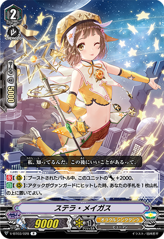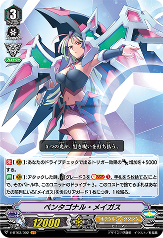 AUTO [V]: When it attacks, COST[S-Blast (1) grade 3 & discard five cards from your hand], and this unit gets drive +3 until end of that battle. Discarding cards from your hand for this cost is reduced for each rear-guard with "Magus" in its card name in your front row.