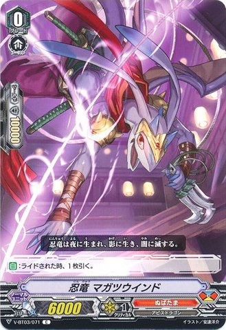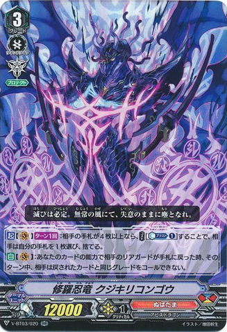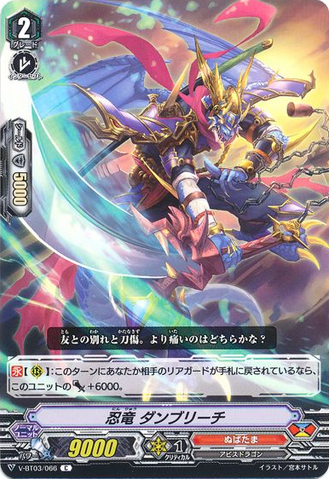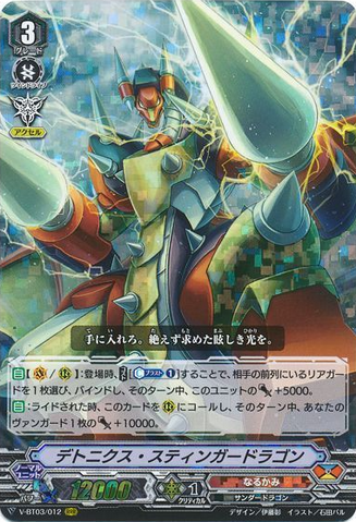 AUTO [V] [1/Turn]: When it attacks a vanguard, COST[C-Blast (1)], choose a rear-guard in your opponent's front row, and bind it. Then, COST[discard the same number of cards from your hand as the number of your opponent's rear-guards], at the end of that battle, [Stand] this unit, and it gets [Power] +5000 / drive-1 until end of turn.
