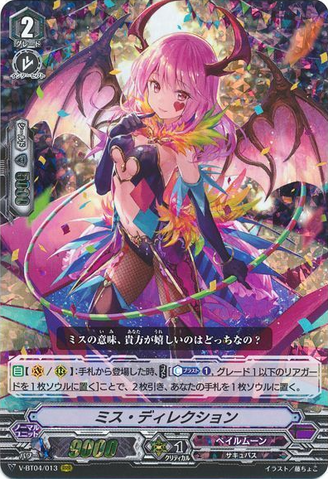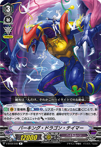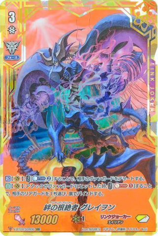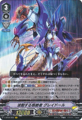 AUTO [V]: When placed, COST[C-Blast (1) & S-Blast (1)], choose one of your opponent's rear-guards, and bind it face down. If you rode from a grade 3, delete your opponent's vanguard, and this unit gets [Critical] +1 until end of turn. (Until the end of that fighter's turn, the deleted unit is turned face down, and loses its [Power] and text)