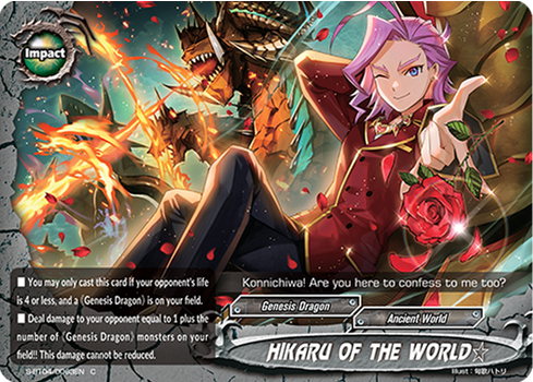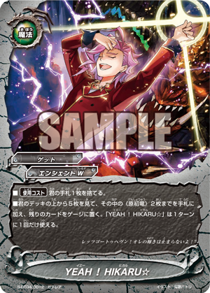 - Look at the top five cards of your deck, put up to two 《Genesis Dragon》 from among them into your hand, and put the rest into your gauge. You may only cast "YEAH!HIKARU☆" once per turn.