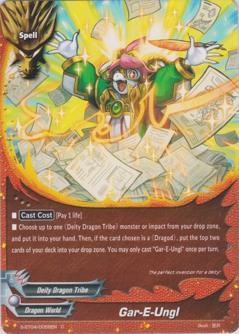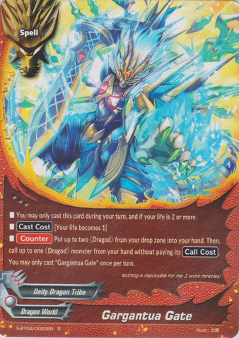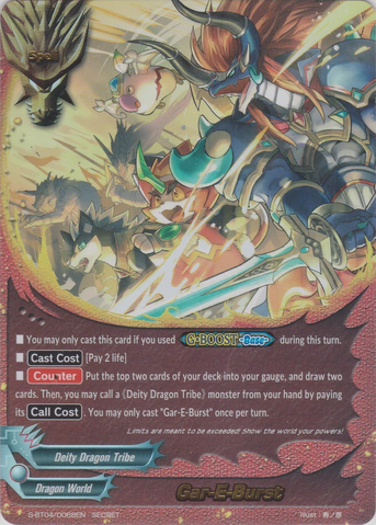 - [Counter] Put the top two cards of your deck into your gauge, and draw two cards. Then, you may call a 《Deity Dragon Tribe》 monster from your hand by paying its [Call Cost]. You may only cast "Gar-E-Burst" once per turn.