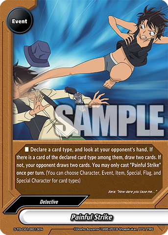 - Declare a card type, and look at your opponent's hand. If there is a card of the declared card type among them, draw two cards. If not, your opponent draws two cards. You may only cast "Painful Strike" once per turn. (You can choose Character, Event, Item, Special, Flag, and Special Character for card types.)