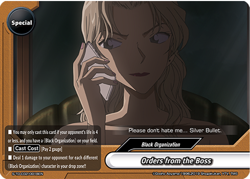 - Deal 1 damage to your opponent for each of your 《Black Organization》 character in your drop zone!