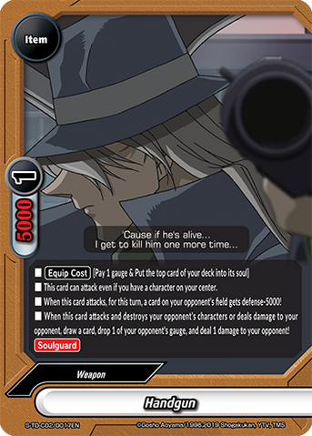 - When this card attacks and destroys your opponent's character, or deals damage to your opponent, draw a card, drop one of your opponent's gauge, and deal 1 damage to your opponent!