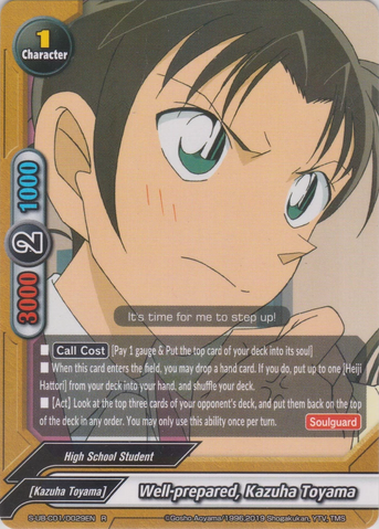 - When this card attacks, declare the card type, and drop the top card from your opponent's deck. If it's the card type you declared, your opponent choose and drops a hand card, and deal 2 damage to your opponent! (The card type you can declare are Character, Event, Item, Special, Special Character, and Flag)