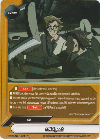 - All 《FBI》 character on your field cannot be destroyed by your opponent's card effects.
