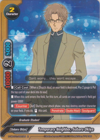 - During your opponent's turn, when this card from the soul is put into the drop zone, put the top card of your deck into your gauge, you gain 1 life, and draw a card.