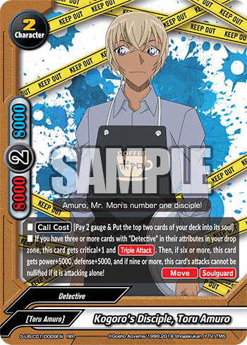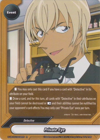 - If you have three or more card in your drop zone with 《Detective》 in its attributes, this card gets critical+1, and [Triple Attack]. Then, if you have six or more, this card gets power+5000, defense+5000, and if nine or more, this card's attacks cannot be nullified if it is attacking alone!