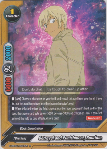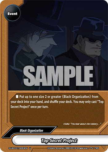 - Put up to one size 2 or greater 《Black Organization》 character from your deck into your hand, and shuffle your deck. You may only cast "Top Secret Project" once per turn.