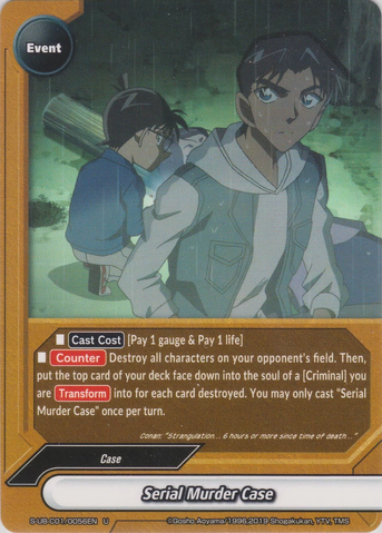 - [Counter] Destroy all character on your opponent's field. Then, put the top card of your deck face down equal to the number of card destroyed into the soul of you are [Transform] into. You may only cast "Serial Murder Case" once per turn.