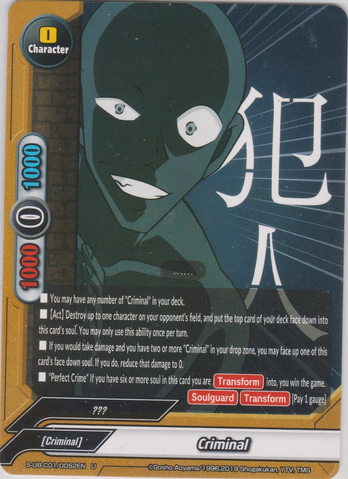 - <Criminal> on your field cannot be destroyed, and their souls cannot be dropped, by your opponent's card effects.