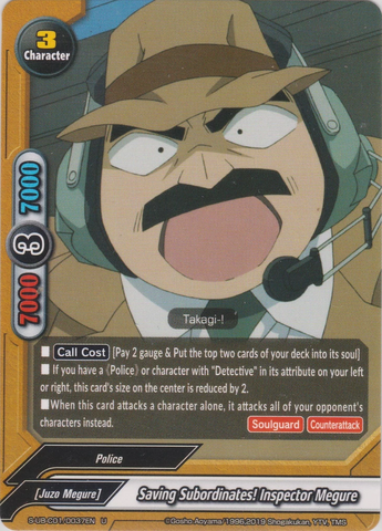 - [Counter] 【Act】 "The Culprit is That Person!" During your final phase, your opponent choose their hand card. Then, you declare the card type, and check the chosen card. If the chosen card is the card type you declared, deal 5 damage to your opponent! This damage cannot be reduced. "The Culprit is That Person!" only activates once per turn. (Card types are character, event, item, special, flag and special character.)
