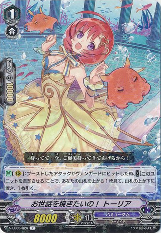 AUTO [R]: When the attack it boosted hits a vanguard, COST[retire this unit], look at the top card of your deck, put it on the top or bottom of your deck, and draw a card.