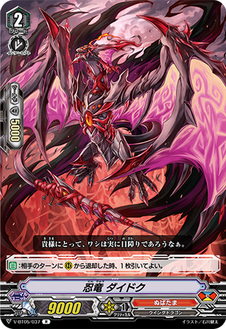 AUTO [R]: When placed, choose one of your opponent's rear-guards in the back row, and your opponent moves it to an open [R] in his or her front row.