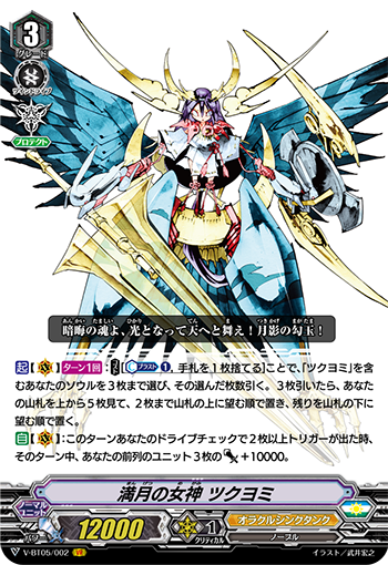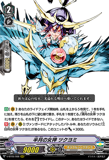 ACT [V] [1/Turn]: COST[C-Blast (1) & Discard a card from your hand], choose up to three cards with "Tsukuyomi" in their card names from your soul, and draw cards equal to the number of cards chosen. If you drew three cards, look at five cards from the top of your deck, put up to two cards from among them on the top of your deck in any order, and put the rest on the bottom of your deck in any order.