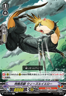 AUTO [V/R]: When placed, COST[S-Blast (2)], search your deck for up to one "Stealth Beast, Spell Hound", call it to [R], and shuffle your deck. Increase or decrease that unit’s and this unit’s [Power] to match your vanguard’s [Power] until end of turn. (Match the [Power] at that time)