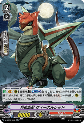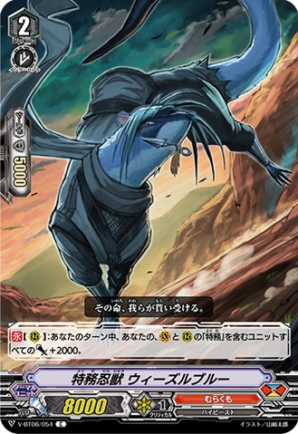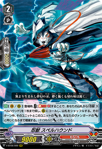 AUTO [V/R]: When placed, COST[S-Blast (2)], search your deck for up to one "Stealth Beast, Spell Hound", call it to [R], and shuffle your deck. Increase or decrease that unit’s and this unit’s [Power] to match your vanguard’s [Power] until end of turn. (Match the [Power] at that time)