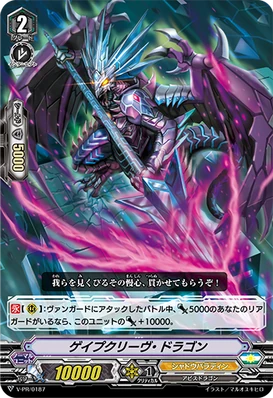 AUTO [R]: When its attack hits a vanguard, COST[C-Blast (1)], your opponent chooses one of his or her rear-guards, and retires it.