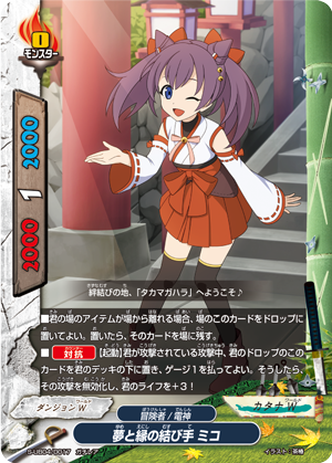 - When your opponent takes damage by your card effects, put the top card of your deck into your gauge, you gain 1 life, and draw a card. This ability only activates once per turn.