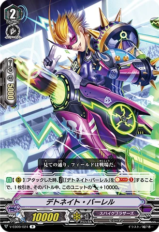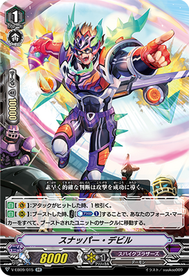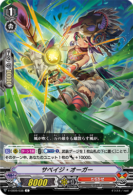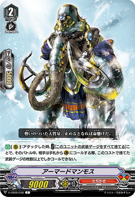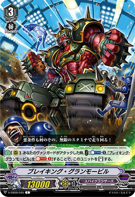 AUTO [V]: When it attacks, COST[C-Blast (1)], [Stand] three of your rear-guards with three or more equip gauges each, and all of your front row units get [Power] +5000 until end of turn.