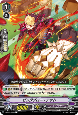 AUTO [V]: When placed, this unit gets [Power] +5000 / drive +1 until end of turn. Then, put the top card of your opponent's deck into the drop zone, and if it is grade 3 or greater, this unit gets [Power] +10000 / drive +1 until end of turn.