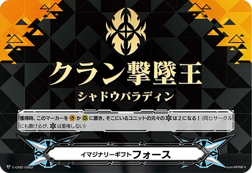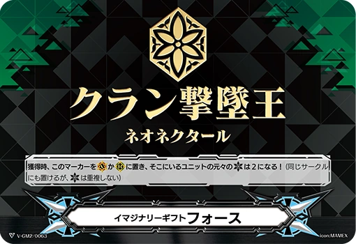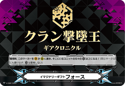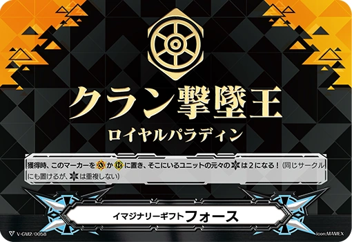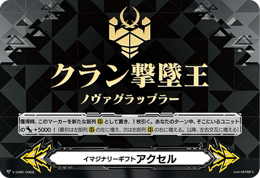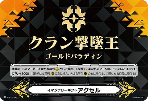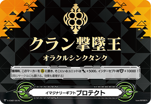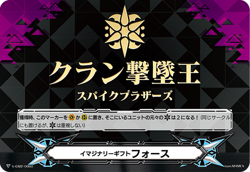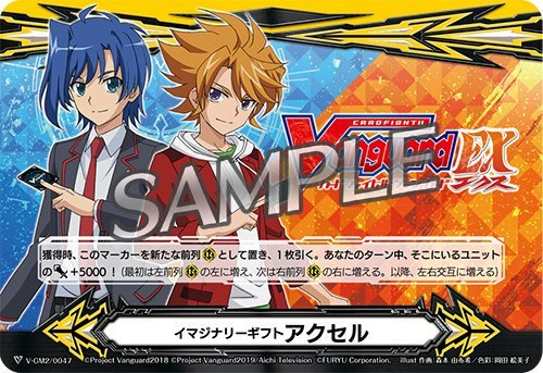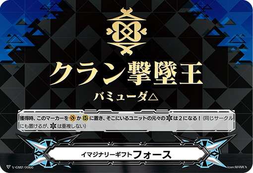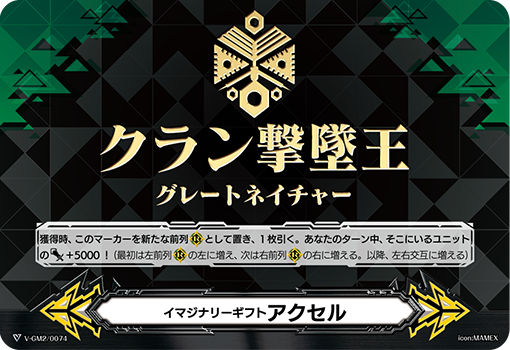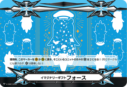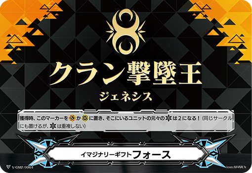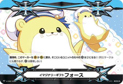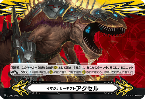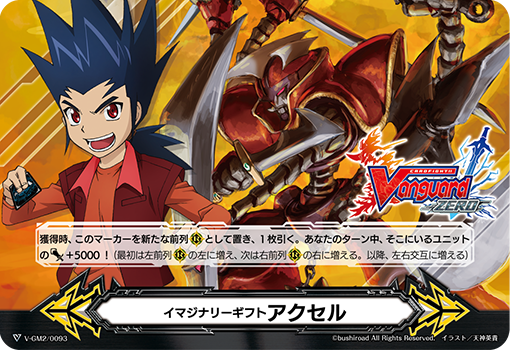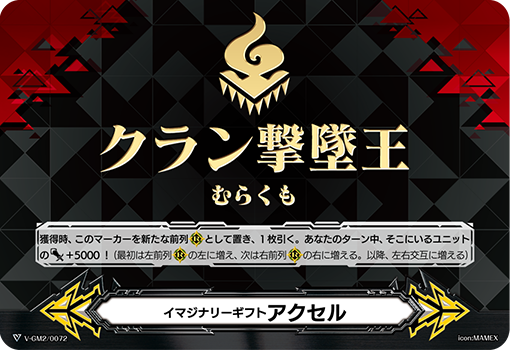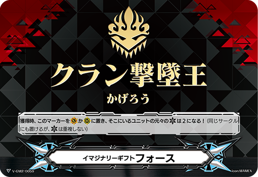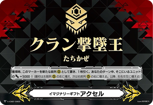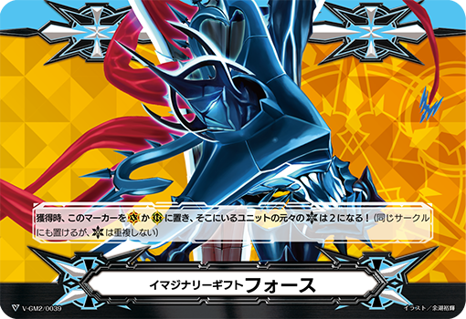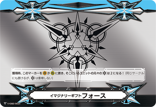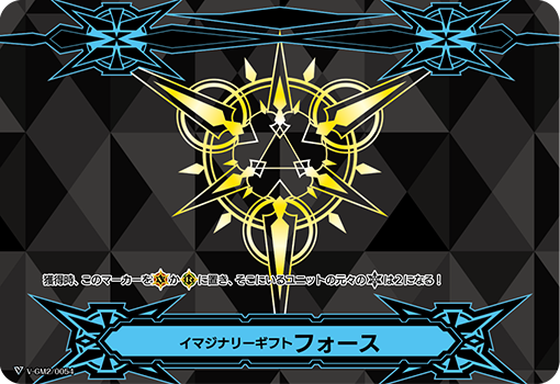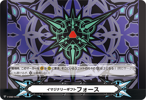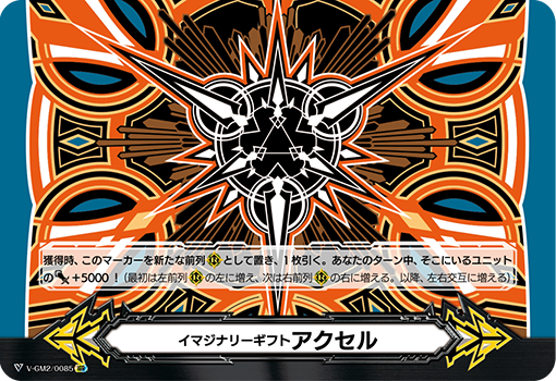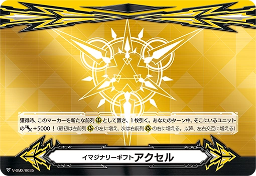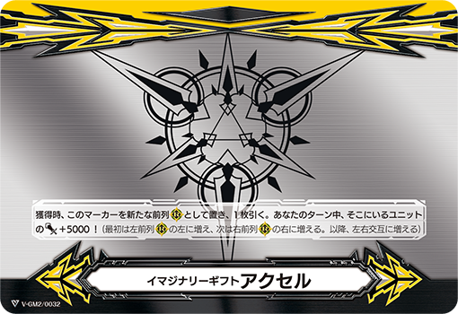 When acquired, put this marker as a new front row [R], draw a card. The unit there gets [Power] +5000 during your turn! (Add it to the left of your front row’s left [R] first, then to the right of your front row’s right [R]. After that, alternate between left and right)