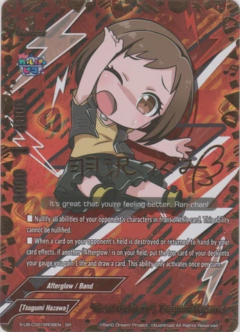 - 【Act】 If you have a <Rinko Shirokane> or <Tomoe Udagawa> on your field, destroy or return to hand a character on your opponent's field. You may only use this ability once per turn.