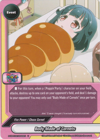 - When a 《Poppin'Party》 character on your field attacks during this turn, destroy up to one card on your opponent's field, and deal 1 damage to your opponent! You may only cast "Body Made of Cornet" once per turn.