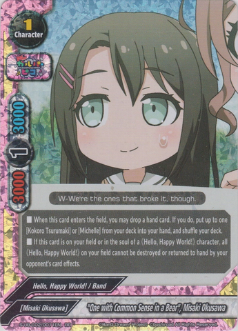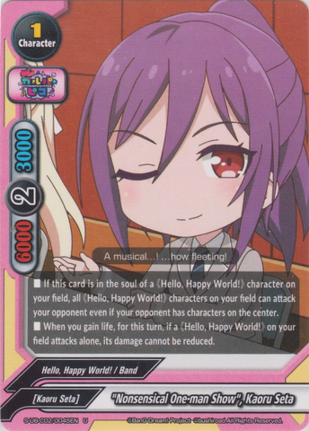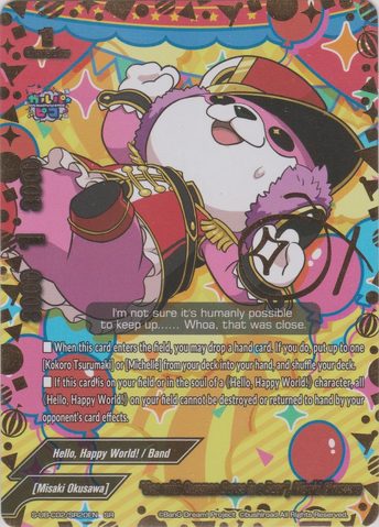 - If this card is on your field or in the soul of your 《Hello, Happy World!》 character, all 《Hello, Happy World!》 on your field cannot be destroyed, or returned to hand, by your opponent's card effects.