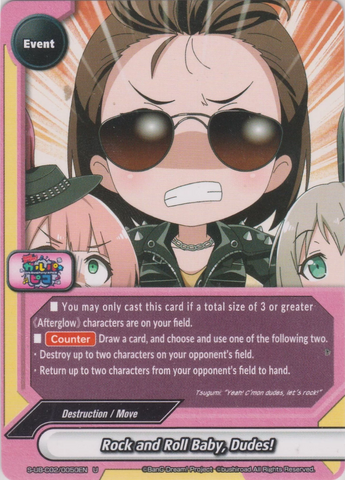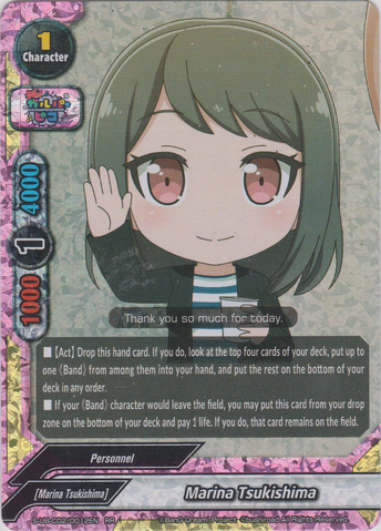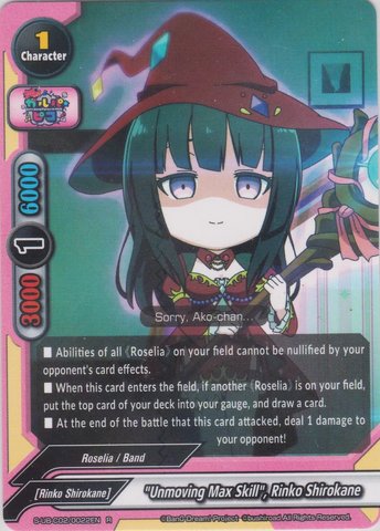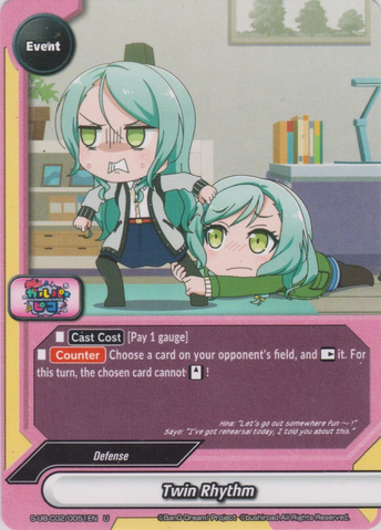 - 【Act】 If you have a <Rinko Shirokane> or <Tomoe Udagawa> on your field, destroy or return to hand a character on your opponent's field. You may only use this ability once per turn.