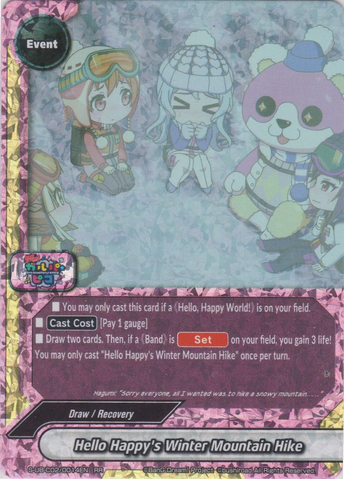- Draw two cards. Then, if a 《Band》is [Set] on your field, you gain 3 life. You may only cast "Hello Happy's Winter Mountain Hike" once per turn.