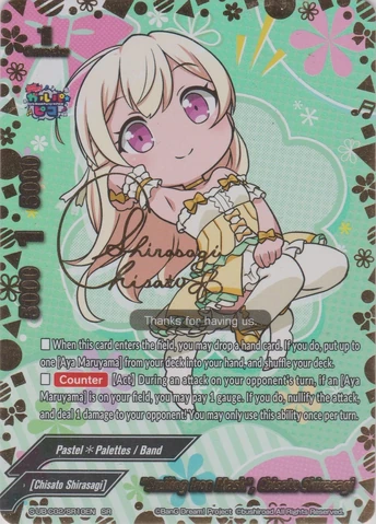 - [Counter] 【Act】 During an attack on your opponent's turn, if you have an <Aya Maruyama> on your field, you may pay 1 gauge. If you do, nullify the attack, and deal 1 damage to your opponent! You may only use this ability once per turn.