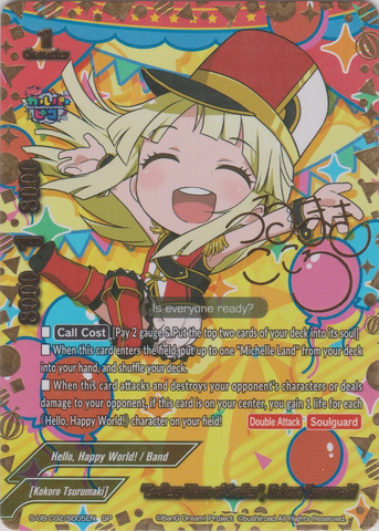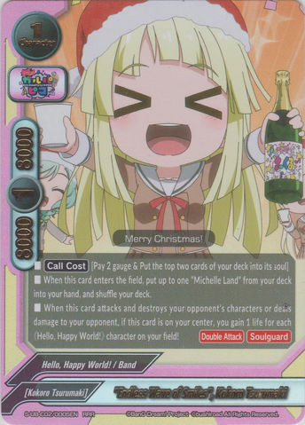 - When this card attacks and destroys your opponent's character, or deals damage to your opponent, if this card is on the center, and you have three or more different 《Hello, Happy World!》 on your field, you gain 1 life for each of 《Hello, Happy World!》 character on your field!