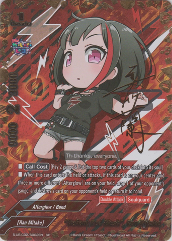 - When this card enters the field, you may drop a hand card. If you do, put up to one <Ran Mitake> from your deck into your hand, and shuffle your deck.